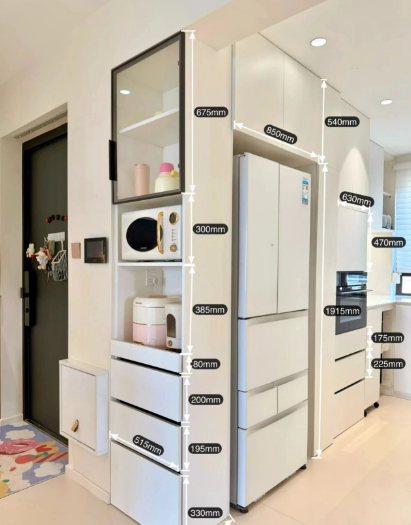 进门先安排一组电器高柜,不仅把冰箱侧面遮得严严实实,看着特整齐,还硬生生给小厨房多挤出快 1 平米的使用空间,简直是小户型救星!