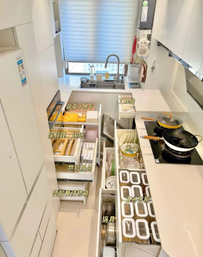 地柜我全做成了抽屉式,之前碗盘、锅具堆在柜子里,翻半天都找不到,现在全竖立摆放,想拿哪个直接拉开抽屉,一目了然,再也不用跟锅碗瓢盆 “打架” 了~