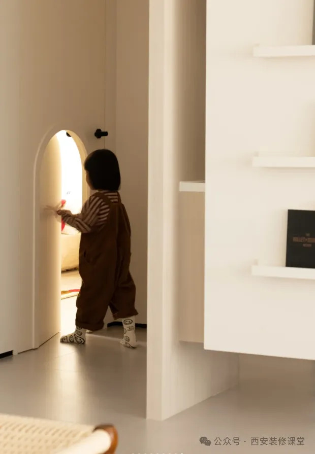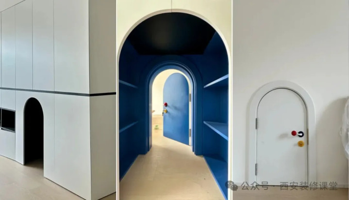网友@小金雯:给娃设计一个专属小门通往客厅,外部为白色与墙面和柜体融为一体,内部设计克莱因蓝,结合红黄色门把手,色彩的搭配充满童趣。