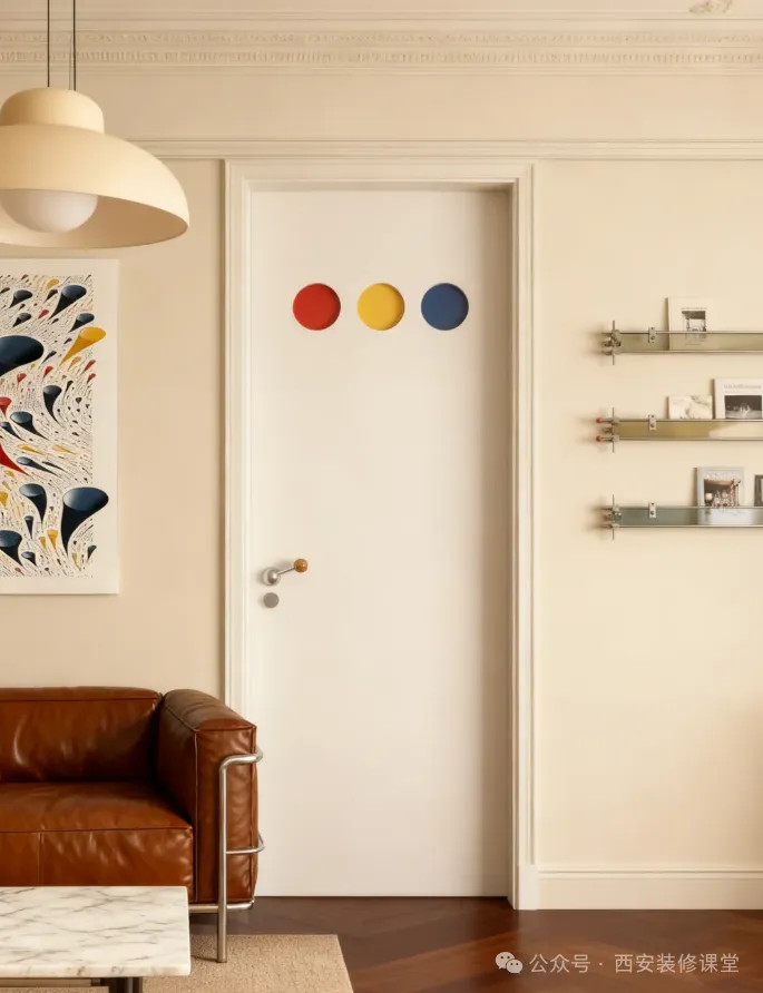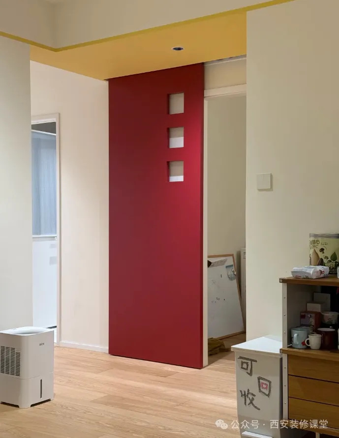 网友@理想少年:儿童房门!红、黄、蓝三原色圆洞撞出艺术感,极简线条利落又高级,金属把手带着工业风的精致,每天推门都像走进现代艺术展。